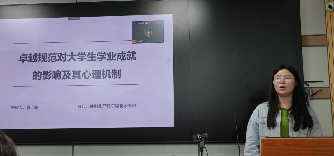 (通讯员:刘甜)2022年5月20日晚7点至8点30分, 第113期社会心理学学术例会在文科大楼910会议室线下线上同步举行。参加例会的有郑雪艳老师和远在美国的严磊老师,以及9名心理学研究生和6名本科生。本次例会由原毅仁同学主持,胡汇鑫同学进行开题设计汇报,研究问题为《卓越规范对大学生学业成就的影响及其心理机制》。