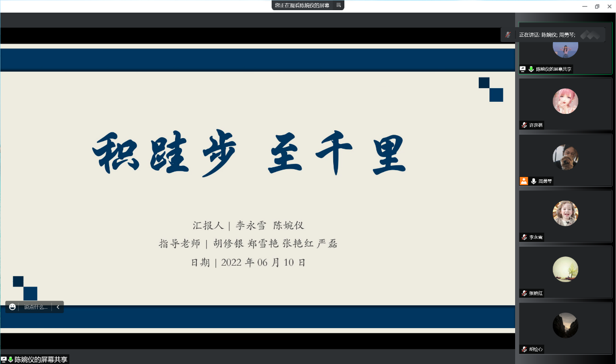 经验分享结束后,研一研二的八位同学汇报了这学期的学习成果和暑假计划,针对同学们的汇报内容,郑雪艳老师指出:1、不积跬步无以至千里,考取博士是一个积累的过程;2、希望大家都能找到自己的目标,无论未来是选择考博还是工作都要铭记六个字:自信、勇敢、坚持;3、学生要有学习的主动性,要加强、要主动与导师沟通。