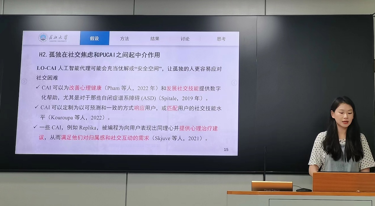 紧接着,吴欣格同学汇报了于2023年发表在《Computers in Human Behavior》杂志上的文章《How social anxiety leads to problematic use of conversational AI: The roles of loneliness, rumination, and mind perception》。该研究认为,对话式人工智能(conversational artificial intelligence, CAI)日益流行,数字代理可以与用户进行社交对话和响应,这同时增加了过度依赖这项新技术的可能性。基于人-情感-认知-执行模型(I-PACE)的相互作用,本研究调查了社交焦虑、孤独和泛出如何导致问题性CAI使用(PUCAI)。该研究还通过分析CAI的类人心理能力如何影响PUCAI来研究心灵知觉的调节作用。据此,对从516名CAI用户(214名男性和302名女性,Mage = 27.06)收集的数据,并构建了一个有调节的链式中介模型。PROCESS宏程序的Model 89的结果表明,社交焦虑与PUCAI呈显著正相关,并且这种联系由孤独和反刍连续中介。此外,心灵知觉强化了社交焦虑与PUCAI之间的正相关,但它缓冲了反刍与PUCAI之间的正相关。总的来说,这项研究通过将I-PACE框架扩展到人机交互的背景并探索基于AI技术的有问题使用的前因,对该领域做出了新颖的贡献。研究结果也具有实际意义,并为未来应对CAI成瘾使用的干预措施提供参考。