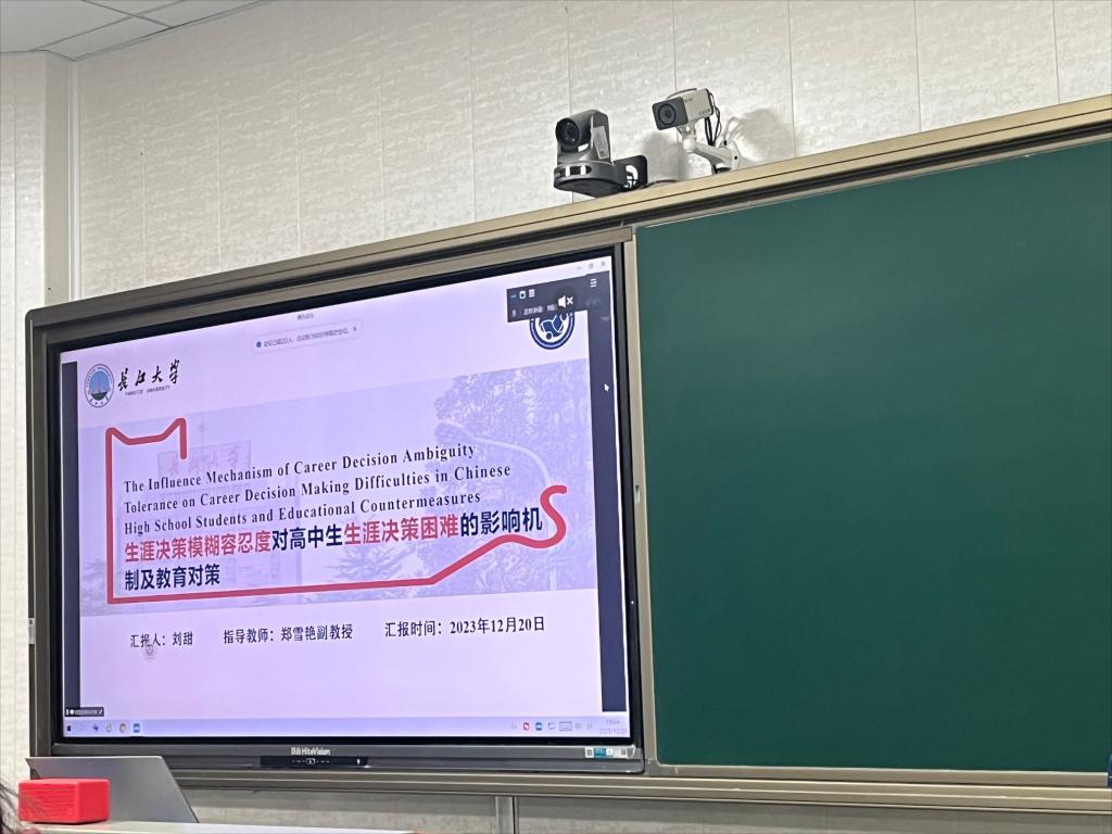 首先,刘甜同学进行汇报,其毕业论文汇报分为两个部分:研究一通过问卷调查的方式探讨了生涯决策模糊容忍度和高中生生涯决策困难的关系,验证了生涯应对策略的中介作用和生涯社会支持的调节作用;研究二通过生涯辅导系列课程对生涯应对策略进行干预以改善高中生的生涯决策困难。
