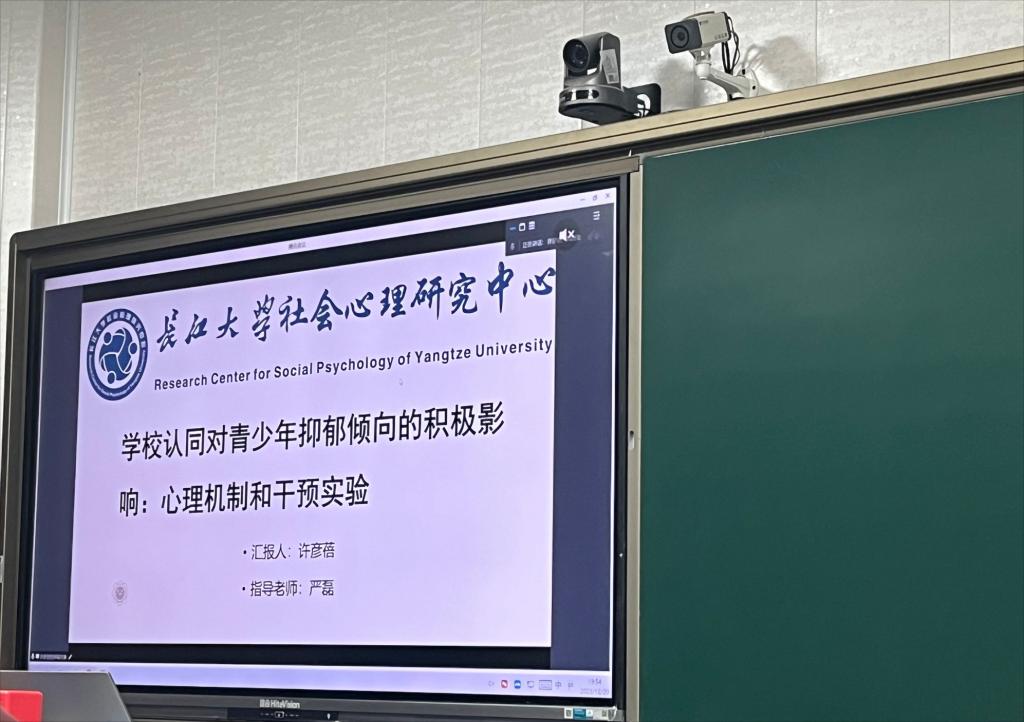 其次,许彦蓓同学进行汇报,其毕业论文汇报分为两个部分:研究一通过问卷调查的方式探讨了学校认同和青少年抑郁倾向之间的关系,结果验证了能动共生资源的中介作用和认同重要性的调节作用;研究二通过团体辅导对学校认同进行干预,以降低青少年抑郁倾向。