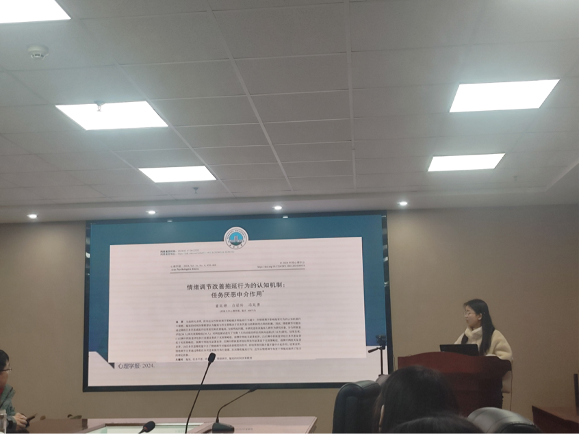 紧接着,胡双双同学汇报了于2024年发表在《心理学报》上的文章《情绪调节改善拖延行为的认知机制:任务厌恶的中介作用》。该文章内容简洁明了,逻辑思路清晰,探究情绪调节与拖延行为的认知机制。胡双双同学从研究背景、研究工具与方法、研究结果与讨论四个方面进行汇报。研究采用2(情绪调节策略:积极重评策略、无效策略)×2(时间点:前测、后测)的混合实验设计。胡双双同学对文章中出现的概念、使用的方法进行讲解,特别介绍了混合线性模型在文章中的使用。汇报结束后,连帅磊老师提出这篇文章很特殊,仅有一个实验,但是研究假设的论述十分严谨,逻辑严密,写作的手法是值得我们深入探讨学习的。朱晓伟老师提出这篇文章对专硕很有借鉴意义,根绝文章可以设计相关的干预来改善学习拖延。周婷老师提出高年级同学可以汇报自己的研究设计,在例会上大家共同讨论,在你一言我一语中使得研究设计变得更完善,研一和本科生同学从基础开始,从文献汇报开始。最后,甘雄老师提出文献的阅读要注重平时的积累,阅读文献就要把相关的一系列都涉及到。就PPT制作和汇报本身对杨蕊嵘同学提出建议,认为应该将文章逻辑呈现得更加清晰明了。
