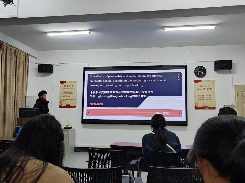 首先,蒲俊伟同学给我们分享2023年发布在《Computers in Human Behavior》杂志上的一篇文献,文章的题目是《The effects of personality and social media experiences on mental health:  Examining the mediating role of fear of missing out, ghosting, and vaguebooking》,蒲俊伟同学从四个方面进行汇报,首先从介绍社交媒体的兴起到社交媒体的使用与心理健康之间的关系,然后也对中介变量概念进行讲解,通过结构方程模型逐步展开研究。随后秦珂楠同学、吴欣格同学提出了自己的疑问,连帅磊老师、朱晓伟老师也同样对蒲俊伟同学进行提问。最后,各位老师对文章进行讨论,朱晓伟老师和朱婷老师对组内同学提出要求,在阅读模型建构这类的文章时一定要阅读里面提及的参考文献才能梳理清楚文章脉络。