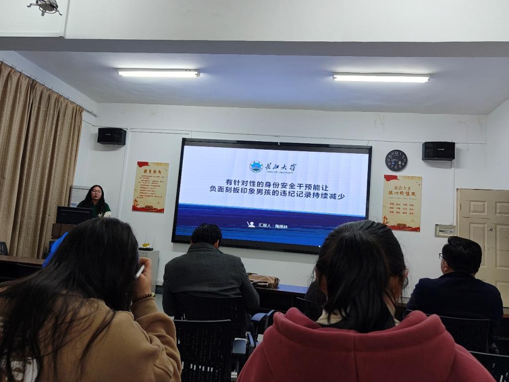 紧接着,陶燕林同学汇报了发布在《Journal of Personality and Social Psychology: Attitudes and Social Cognition》杂志上的一篇文献,文章名为《Targeted Identity-Safety Interventions Cause Lasting Reductions in Discipline Citations Among Negatively Stereotyped Boys》。该文章中有两个纵向实验研究,通过自我肯定、成长思维、社会归属相关干预从而观测这些干预措施对消极刻板印象威胁的作用。汇报结束后,有本科同学提出相关疑问,陶燕林同学仔细回答相关问题。最后朱晓伟老师谈到专硕同学要积极关注与自己研究领域相关的干预,学习迁移到自己的研究当中,努力搜寻干预材料从而帮助完善毕业论文。