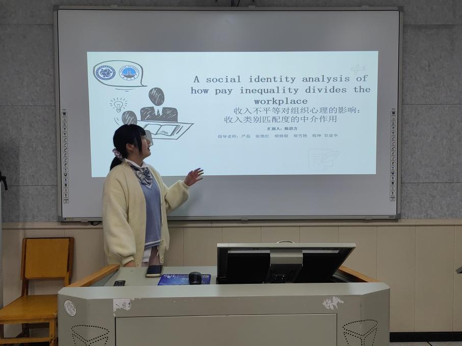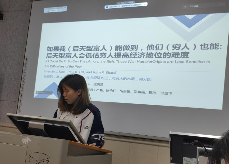 接着,王悦慧同学研究背景、实验设计及自身感悟方面展开汇报该研究就一般民众对“后天型富人的好感与期待、“后天型富人对穷人的支持与同情两方面进行探讨。结果表明:(1一般民众对后天型富人更有好感,更期待后天型富人对穷人有支持和同情;(2)“后天型富人认为提高社会经济地位容易对穷人有较少的支持和同情