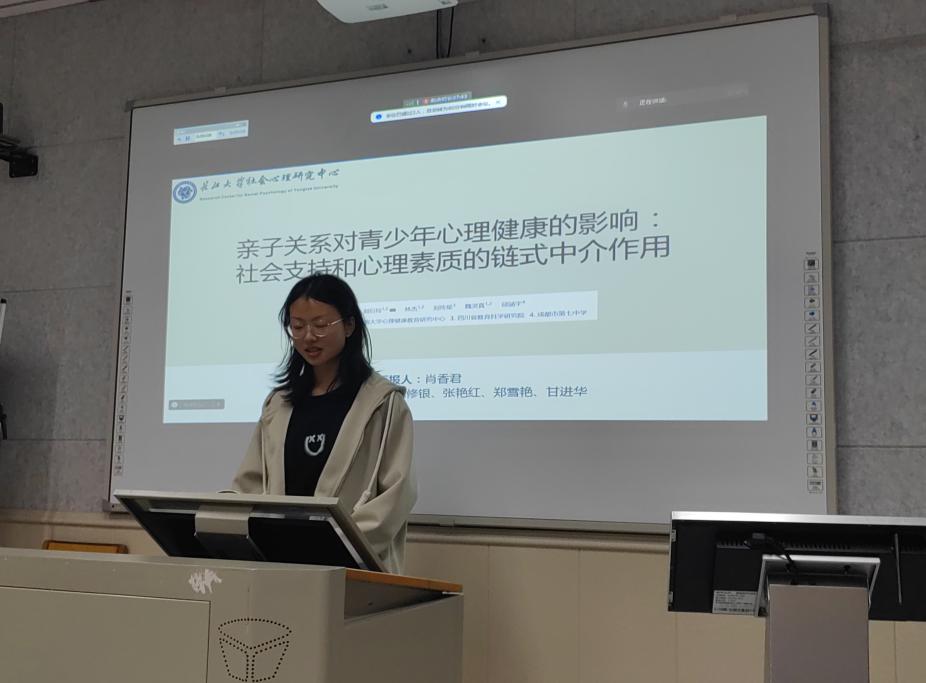 最后,肖香君同学汇报的文献采用问卷法调查了四川、辽宁、湖北、安徽、福建、山东、云南等23个省(市)的中学生亲子关系社会支持心理素质心理健康水平,探讨了亲子关系与中学生心理健康之间的内在作用机制以及社会支持和心理素质在其中的中介作用,为中学生心理健康问题的预防和干预提供了实证依据,为家校合作扩展了新的路径。