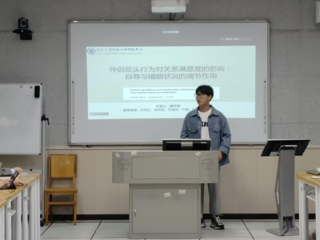 接着,魏子旭同学汇报的文献基于符号互动主义理论,探讨了自尊与婚姻状况在伴侣低头行为与关系满意度之间的作用。结果发现:(1)已婚成年人的伴侣低头行为负向影响关系满意度;(2)高自尊的成年人伴侣低头水平越高,关系满意度水平越低。该研究的发现有助于设计有效的心理干预措施来提高已婚成年人之间的关系满意度。