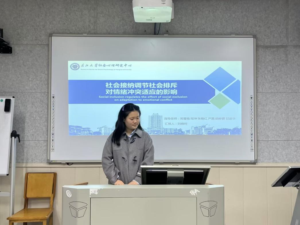 首先,刘晓珂同学从研究背景、实验设计及结果讨论等方面展开汇报。该研究首次采用Cyberball游戏和面孔−词Stroop范式,考察了社会接纳在社会排斥与情绪冲突适应中的调节作用。结果发现:(1)社会排斥降低个体的情绪冲突适应;(2)社会排斥前的社会接纳具有保护作用,能够减轻被排斥者情绪冲突适应的降低。这篇研究不仅有助于理解社会排斥与情绪问题之间的关系,而且为降低社会排斥带来的心理风险提供可行性方案。