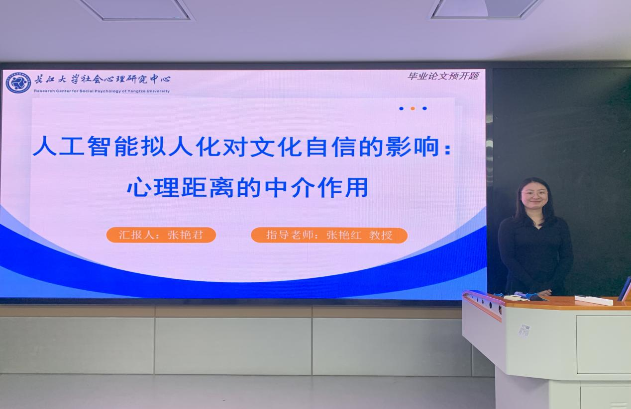 例会的第一个环节是:由张艳君、周久远、刘嘉玲三名同学进行毕业论文的开题报告。首先是张艳君同学,她对《人工智能拟人化对文化自信的影响:心理距离的中介作用》进行了汇报。在提出“人工智能拟人化能促进文化自信”的观点后进一步提出假设:心理距离在人工智能拟人化与文化自信之间起中介作用。研究中,预计采用问卷法和实验法,深入研究了人工智能拟人化对个体文化自信的影响以及心理距离在此过程中的作用机制。汇报中,她还阐述了自己论文的后续安排以及研究过程中存在的困惑。