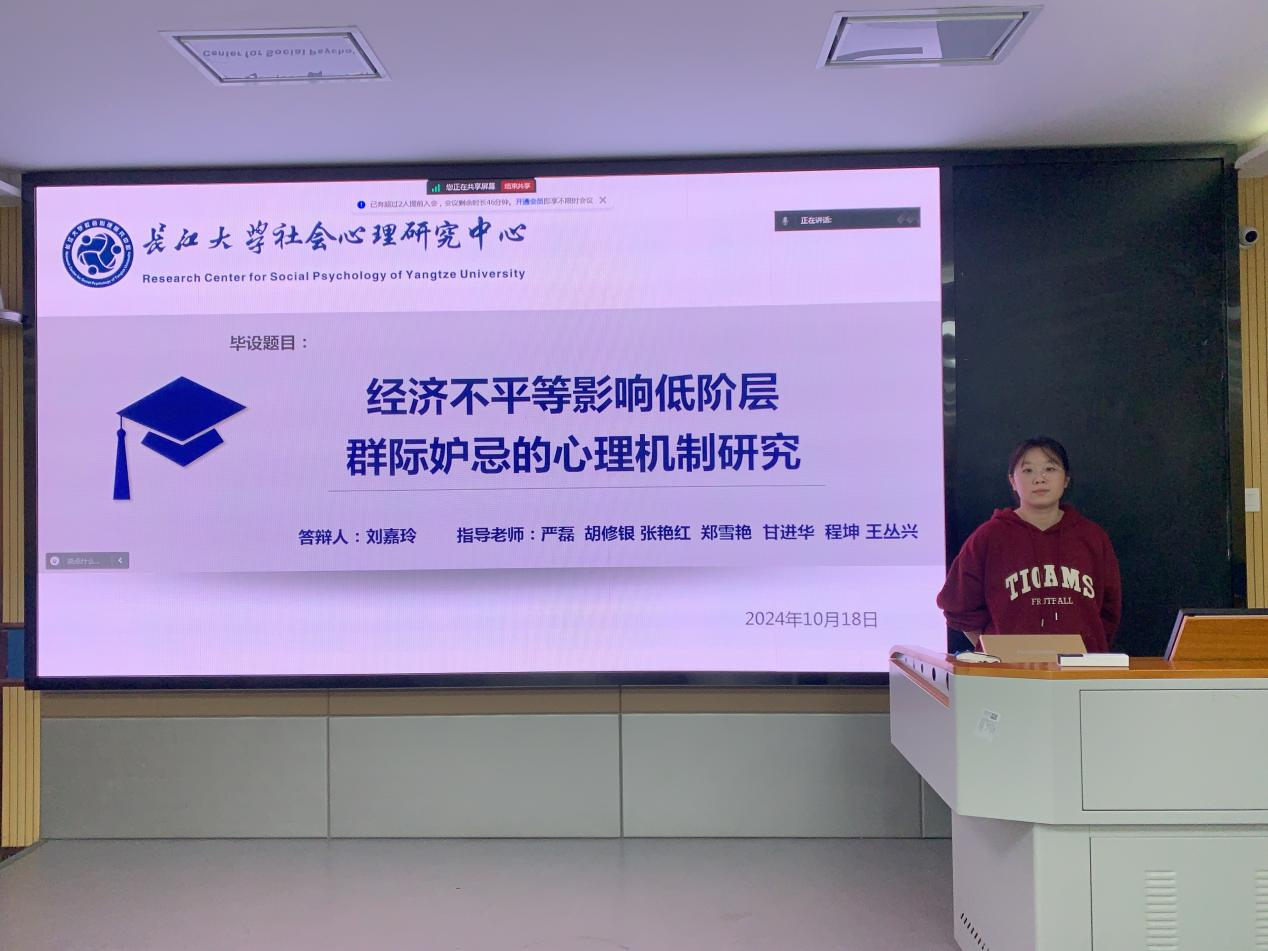 最后是刘嘉玲同学,她对《经济不平等影响低阶层群际妒忌的心理机制研究》进行了汇报。她就经济不平等的现状,遵循“概念澄清-因果关系-机制探索”的思路,预对低阶层的群际妒忌进行研究。通过大数据词频分析法、因素分析法、实验室实验法、问卷调查法等多种研究方法来探索其中的心理机制。汇报最后,她也提出了自己的疑问以及说明了后续的研究安排。