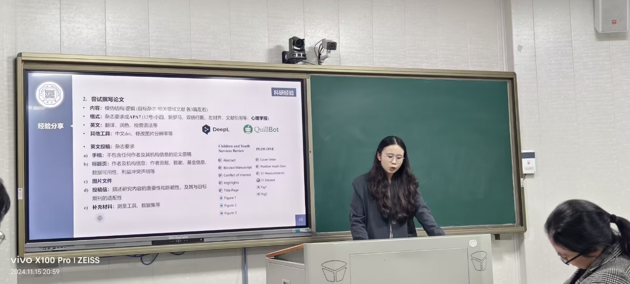 茶话会之后,秦柯楠同学还进行了一次经验分享。他结合自己的学习和研究经历,与大家探讨了如何高效管理时间、如何克服研究中的困难以及如何保持良好的心态等问题。他的分享既实用又鼓舞人心,让在场的同学们受益匪浅。