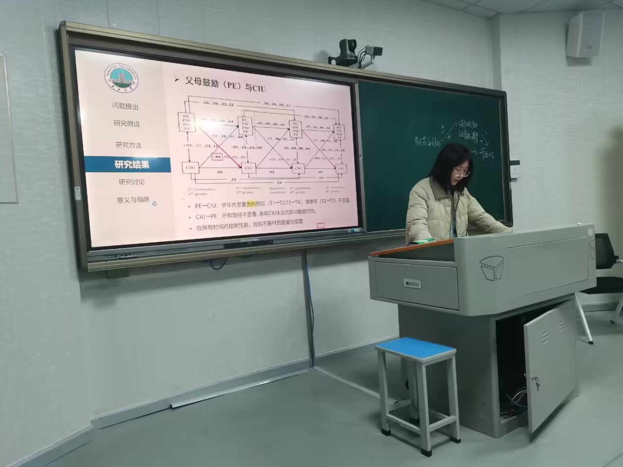 接下来管师师同学汇报了一篇发表在《Computers in Human Behavior》上的文章题为Longitudinal association of adolescents’ perceptions of parental mediations and compulsive Internet use》。该研究通过追踪四波数据,对父母教养方式和青少年强迫性互联网使用的关系进行了更加深入的研究朱晓伟老师认为英文翻译成中文时要注意准确性,而且针对“mediations ”是翻译成调解还是调节进行了讨论。此外,朱老师认为在汇报时要注意理论对变量之间关系的解释,并鼓励大家从每周的汇报中学习新知识,寻找新方法,开拓新领域。