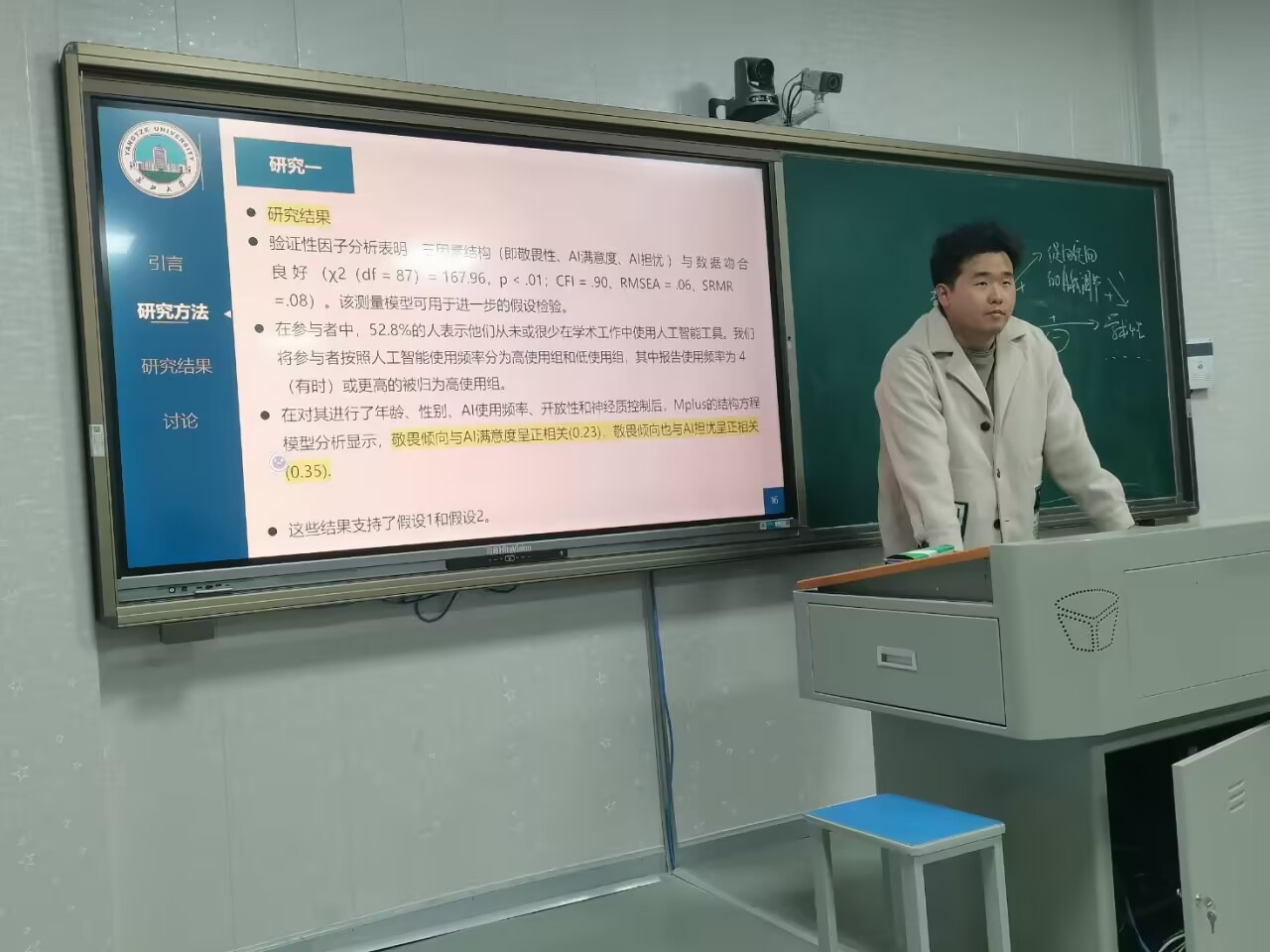 本次例会我们有幸听取了位同学的精彩汇报。首先王佳祥同学分享了一篇2024年发表在《Computers in Human Behavior: Artificial Humans》上的文章,题为《Contradictory attitudes toward academic AI tools: The effect of awe-proneness and corresponding self-regulation》。该研究专注于近期火爆的人工智能,探讨了敬畏倾向与学术性人工智能使用的关系汇报结束后,朱晓伟老师对敬畏和敬畏倾向进行了区分,解释了此研究的特殊性并且连帅磊老师对于具体的纵向研究方法进行了更加深刻的讲解,并且对同学们提出了数据方法学习的要求。