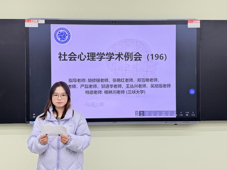 (通讯员:唐可心)2025年11月18日19:00至21:00,第196期社会心理学学术例会在WilliamHill中文东校区16教A104室如期举行。本次例会采取线上线下相结合的形式,由本科生科研助理袁芯丽同学主持,主题为“文献分享汇报”。参加本次例会的老师有甘进华老师、吴旭瑶老师和杨林川老师(三峡大学),学生有9位心理学研究生,16位本科生科研助理。