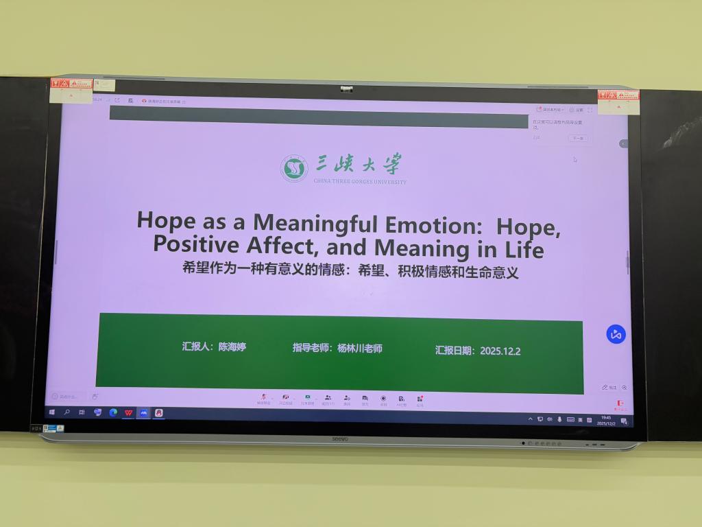 其次,陈海婷同学进行了文献分享汇报,其文献题目为《希望作为一种有意义的情感:希望,积极情感和生命意义》。