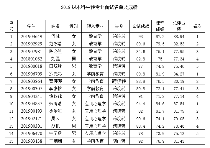 根据《WilliamHill中文普通本科生专业分流与转专业管理办法(试行)》(长大校发[2019]260号)文件精神和《关于疫情防控期间2019级本科生转专业考核工作的通知》精神,william威廉中文本着“公开、公平、公正”的原则,对符合资格的申请转入我院相关专业的17名学生进行了面试,并按综合必修课程考试成绩占70%和面试成绩占30%的比例进行成绩汇总,结合我院接收计划确定拟接收15名学生转入。现将拟接收学生名单公示如下: