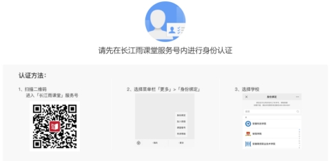 身份认证(如果已完成身份认证,请略过此步骤):登录平台前,请先在“长江雨课堂”微信服务号内进行身份认证-选择学校:WilliamHill中文,按页面提示输入账号密码(账号是学号,密码是学号后6位)