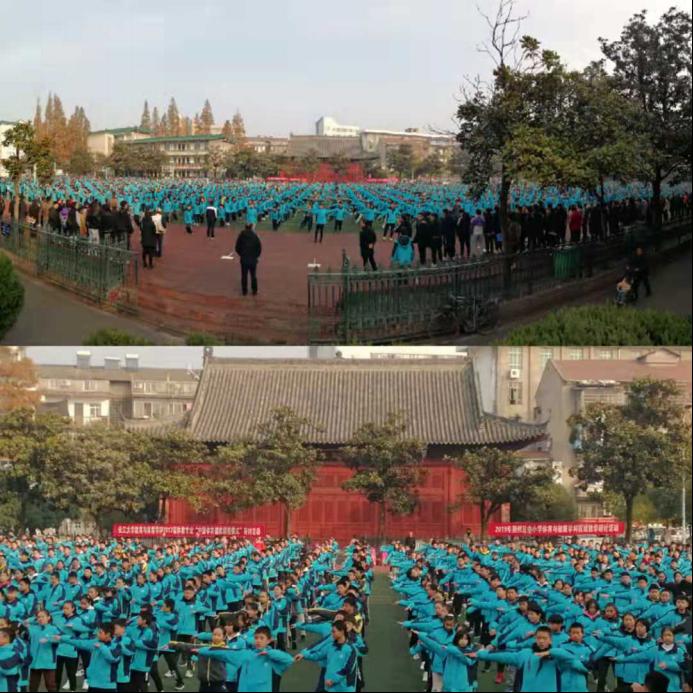 在大课间活动环节实验中学展示了广播体操和校园特色啦啦操活动。