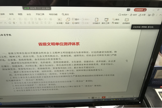 首先,张艳红副院长对近期教学工作情况进行通报,重点是在线教学开展情况与存在问题,并对后期教学工作进行了安排与提出要求。接着,李焕玉书记带领全体教职工学习了《深刻认识高校意识形态工作的重大意义》、《WilliamHill中文校园意识形态阵地管理暂行办法》,并对教职工在教学、科研与网络安全等方面提出了具体要求。最后,按照学校5月份政治理论学习安排,学院党委副书记李则俊通过腾讯会议在线文档功能带领全体教职工学习了《习近平在陕西考察时强调 扎实做好“六稳”工作 落实“六保”任务奋力谱写陕西新时代追赶超越新篇章》、《习近平主持召开中央全面深化改革委员会第十三次会议:强调深化改革健全制度完善治理体系——善于运用制度优势应对风险挑战冲击》、《习近平主持中共中央政治局常务委员会会议:分析国内外新冠肺炎疫情防控形势——研究部署完善常态化疫情防控举措,研究确定支持湖北省经济社会发展一揽子政策》等一系列关于疫情防控和复工复产讲话精神,学习了冯征校长的署名文章《“凡事三有”推进大学治理现代化》、《高校师生新型冠状病毒肺炎个人防护指引》以及《省级文明单位测评体系》。