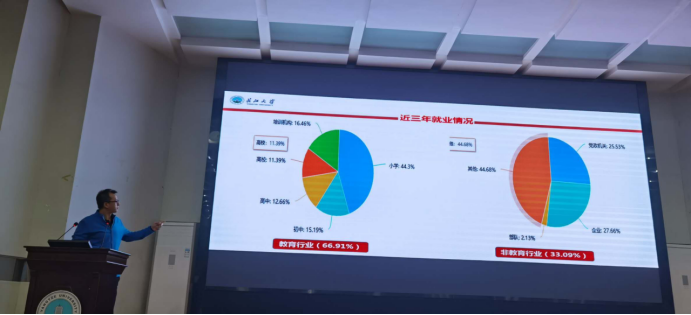 接着,体育教育系的杨青宝老师介绍了体教专业的基本概况、培养方案以及就业前景。国家强化对运动技能和体育教育能力的培养。随着国家的重视、社会需求的增大,体育教师的地位越来越高,前景越来越光明。