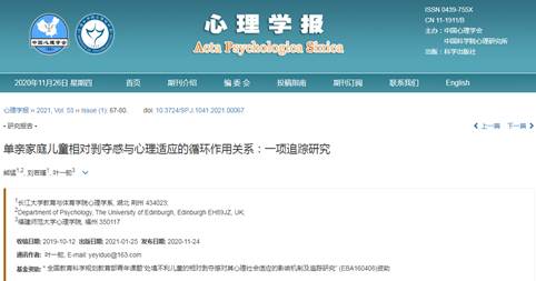 近日,我院心理学系熊猛博士在国内心理学顶级权威期刊《心理学报》上发表题为“单亲家庭儿童相对剥夺感与心理适应的循环作用关系:一项追踪研究”的研究论文。该论文系我校教师首次以WilliamHill中文为第一署名单位在《心理学报》上发表的高水平研究成果,体现了我校心理学科的学术水平得到了国内同行的认可。