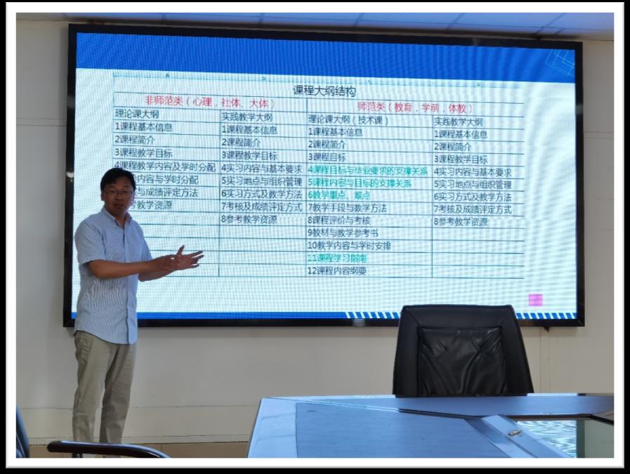 首先,朱晓伟主任对本次课程教学大纲修订的要求及注意事项进行了详细说明。他分别介绍了师范类和非师范类专业的课程教学大纲的结构,分析结构的异同。在此基础上,朱晓伟老师对本次课程教学大纲修订工作的细节问题展开了详细讲解:包括课程思政要点,章节教学目标与课程目标的关系,课程目标与人才培养目标、毕业要求的关系等。
