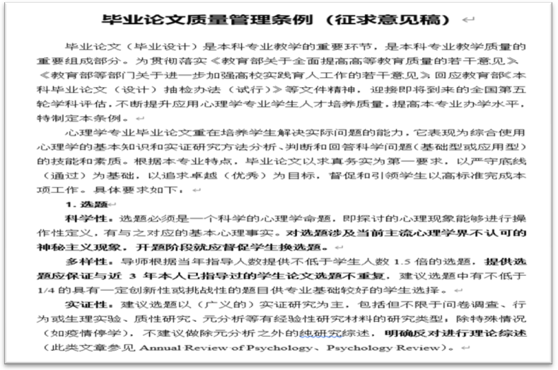其次,老师们一致认为在本科学位论文答辩结束后,就《应用心理学专业毕业论文质量管理条例》(征求意见稿)进行讨论能够起到事半功倍的效果。因此,老师们不顾参加毕业论文答辩后的疲惫,就应用心理学专业毕业论文的过程管理、质量提升展开了深入探讨。朱主任介绍了他与严磊博士共同起草的《应用心理学专业毕业论文质量管理条例》(征求意见稿)进行了详细介绍,并就设立相关内容的初衷进行了阐释。在朱主任讲解“条例”的过程中,老师们对“条例”的内容展开了深入探讨,老师们一致认为管理条例的制定与实施对提升应用心理学专业毕业论文的质量提升具有重要意义。