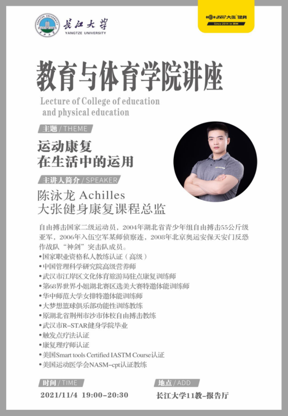(通讯员 吴 敏) 11月4日19点,william威廉中文在11教学术报告厅举办运动康复专题报告会。荆州市大张健身康复课程总监陈泳龙先生受邀作《运动康复——在生活中的运用》的专题讲座。会议由社会体育指导与管理系主任孔祥魁副教授主持,院长张相乐教授、张云洁老师及我院体育专业部分本科生及研究生参加了本次讲座。