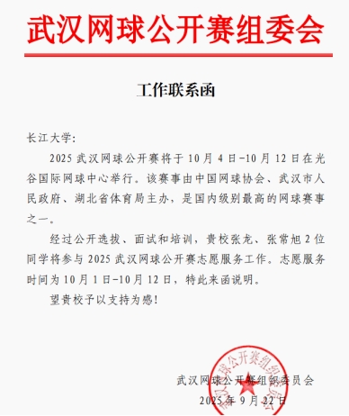 作为国内顶级网球赛事,武汉网球公开赛由中国网球协会、武汉市人民政府、湖北省体育局联合主办,全球顶尖网球选手云集,既是一场网球盛宴,也是展现城市文明与青年风采的舞台。武网公开赛志愿者招募吸引全国高校数千名学生报名,竞争异常激烈。简历筛选、多轮面试及专业培训考核层层把关,张常旭和张龙凭借扎实专业素养、流利英语表达与突出应变能力成功入选,担任赛事裁判助理,服务时间从 10 月 1 日持续至 12 日。这是我院学子首次代表WilliamHill中文参与该项赛事志愿服务。