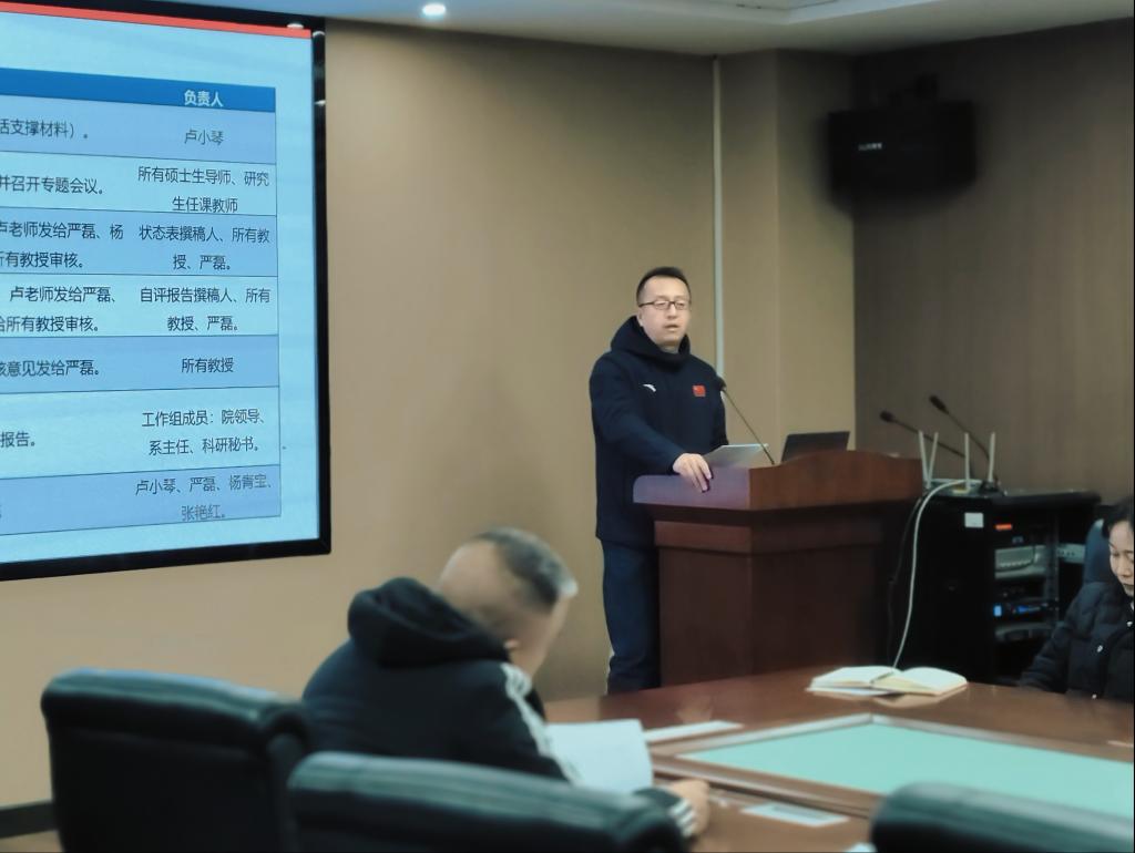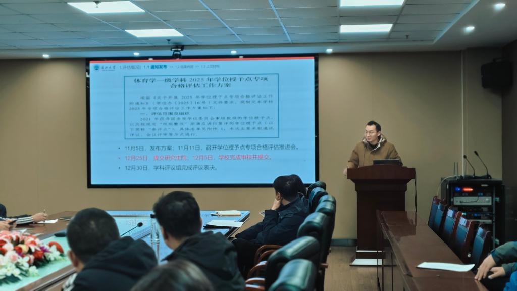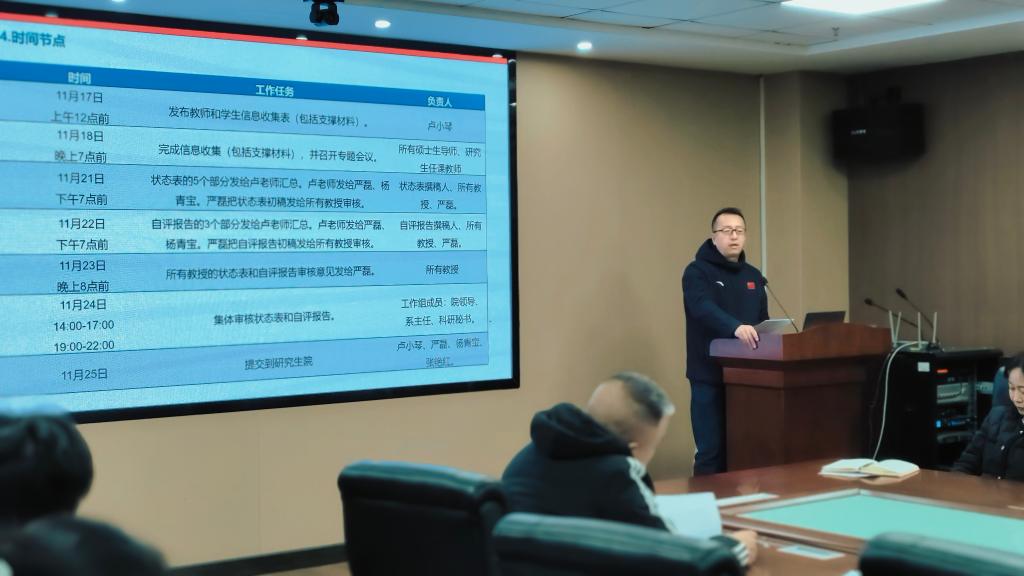会上,院长助理严磊博士围绕评估指标体系,结合体育学学科发展实际,对前期评估筹备工作进行了全面细致的总结分析,对下一步推进工作进行任务分工。他从材料梳理、师资建设、教学改革、特色凝练等关键环节入手,明确了各工作小组的具体任务与时间节点,要求全体参会人员对照任务清单,压实工作责任,确保每项工作落地见效、有据可查。杨青宝副院长就评估材料准备、数据填报的相关注意事项作了说明。