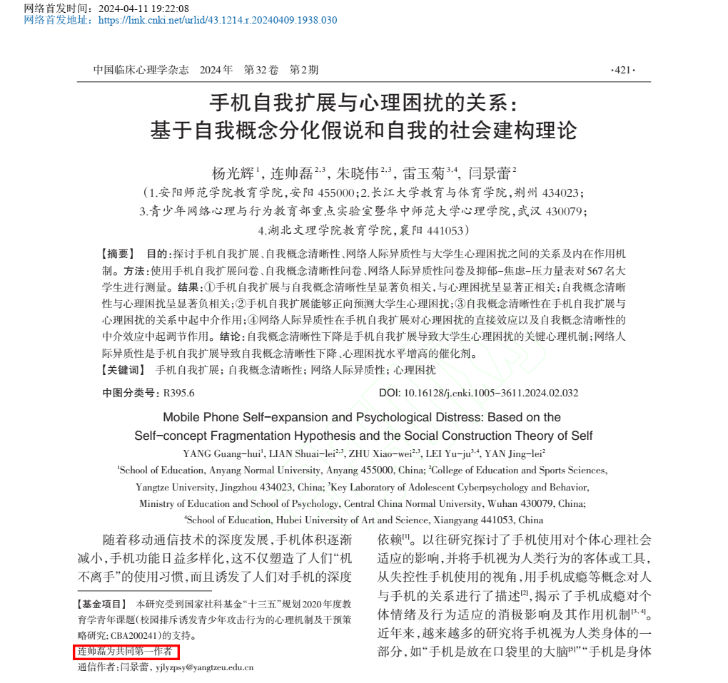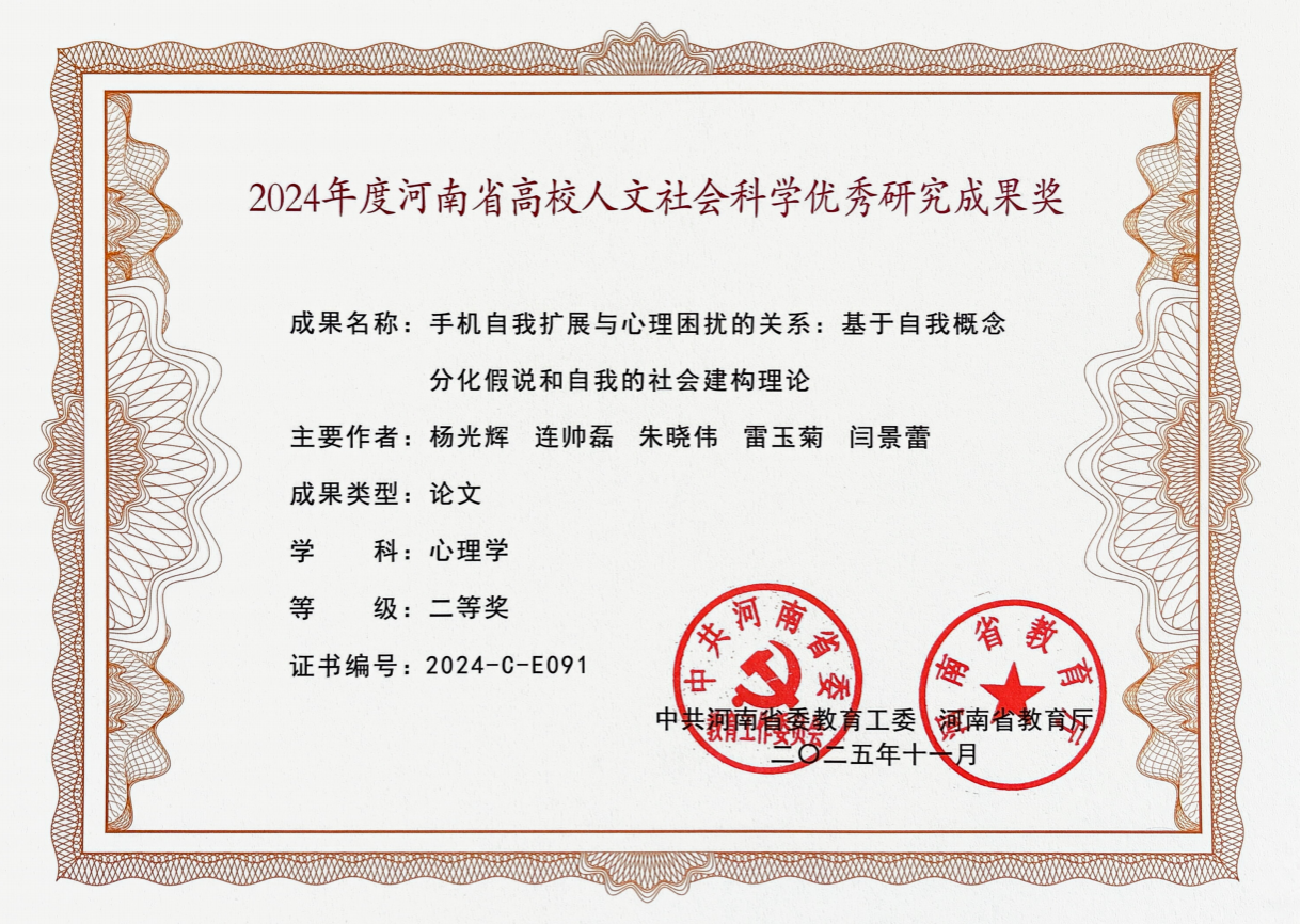 (通讯员:何巧楠)近日,2024年度河南省高校人文社会科学优秀研究成果奖获奖名单正式公布,由我院连帅磊副教授作为共同第一作者完成的研究论文《手机自我扩展与心理困扰的关系:基于自我概念分化假说和自我的社会建构理论》荣获二等奖。