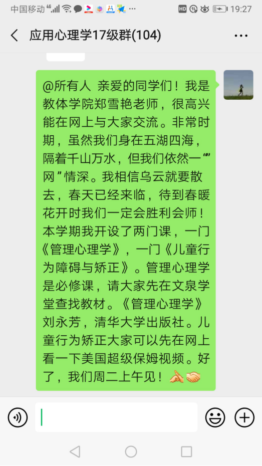 在教学过程中郑老师不仅注重学生对理论知识的掌握,更是充分发挥了课堂思政的作用,同时也对处于特殊时期的学生及时运用专业知识进行心理疏导。在网络教学过程中,郑老师要求同学们在听课前准备好笔和笔记本,坐在电脑前或者拿出手机放在桌上听课,这样便于集中注意力。促进同学们养成良好的学习习惯,在《儿童行为矫正》课中,鼓励同学们运用学到的知识点,对自己的良好行为进行强化,鼓励同学们运用专业知识帮助自己、家人和朋友。在授课过程中,有些同学有些焦虑、恐惧、悲伤等情绪,问到什么时候可以回学校,有些同学在家里呆久了烦躁无聊,有些同学每天过度关注疫情信息,甚至导致了替代性创伤,郑老师在课堂教学中结合案例,运用心理学知识安抚同学们情绪,帮助同学们客观分析各种信息,学会接纳,学会反思,学会沟通。让每个同学问问自己,“我在这场防疫战斗中,我的专业能为防控做点什么?”“我能做出什么贡献?”。