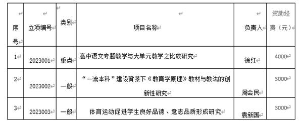 为了进一步深化我院教育教学改革,不断提高教育教学质量和教学管理水平,引导教师积极参加教学改革与研究,根据学校《关于申报2023年度教学研究项目的通知》、《关于2023年湖北省本科高校省级教学改革研究项目(大学体育专项)立项申报的通知》,经过教师申报、教学委员会评审,《高中语文专题教学与大单元教学之比较研究》等3个项目批准为2023年院级教研立项项目。现就有关事宜通知如下:
