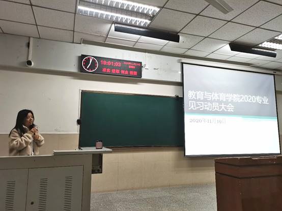 大会伊始,冯雪老师和徐发秀老师为同学们介绍了本次见习的任务及内容,帮助同学们熟悉见习流程,明确见习目的。随后,张艳红副院长致辞。张院长提出了“双重管理”的要求——要求同学们在校服从教体学院管理,在见习期间服从实习单位管理。接着,张院长强调了“两个意识”,即纪律意识和安全意识,希望同学们“立德树人,以身作则”,为学生树立榜样,同时注意防疫安全和路途上的交通安全。最后,张院长向大家提出“两个希望”,希望同学们在实践中检验和巩固自己的理论知识,同时提升自己的教学专业技能;希望大家能提升自己的综合能力,将见习当做试金石,开心而去,平安而回。在掌声中,本次大会圆满结束。