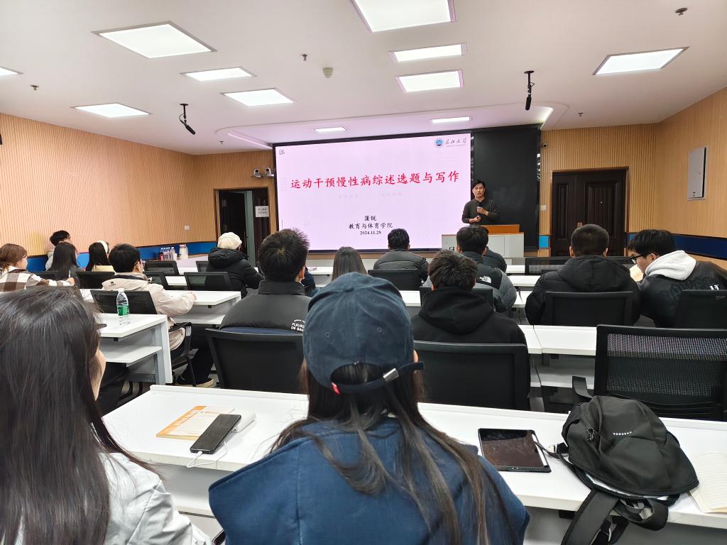 蒲锐老师报告的主题是《运动干预慢性病综述选题与写作》,他从综述、运动干预慢性病综述选题与写作三个部分展开分享。首先对综述的写作意义、含义、特点、写作步骤以及综述与论著展开论述,从总体上介绍了论文综述的框架。他强调选题对论文写作的重要作用,指导同学们选题要学会抓住体育学科前沿以及查阅运动干预慢性病相关文献。