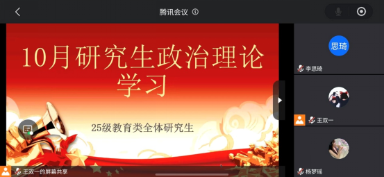 (通讯员 刘琦)2025年10月24日至27日,william威廉中文全体博士、硕士研究生围绕“赓续红色血脉,勇担时代使命”主题,开展10月政治理论学习。本次学习以班级班会集中研学、分组讨论为主,课余时间个人自学为辅,旨在引导研究生把学习贯彻习近平新时代中国特色社会主义思想不断引向深入,把党的二十大精神转化为勇攀学术高峰、投身教育强国建设的强大动力。