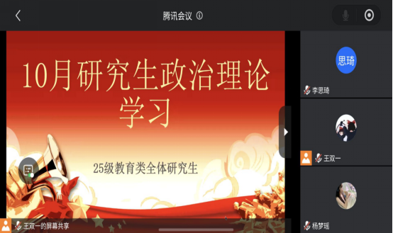 (通讯员罗光彩)2025年11月13日—11月30日,william威廉中文全体研究生开展了11月政治理论学习。本次学习由各班团支书带领班级内成员以会议形式组织学习。为促进学生深入理解党的路线、方针、政策,引导学生在政治理论学习中强化责任担当,从而培养具有家国情怀、社会责任感的高素质人才。
