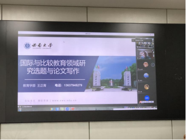 活动伊始,熊猛副院长隆重地介绍了王正青教授,王教授主要从事和平教育理论与实践、教育信息化国际比较、中亚国家教育改革与发展等领域研究,主持国家社科基金、教育部人文社科、全国教育科学规划课题等省部级课题10余项,在《教育研究》等CSSCI期刊发表文章80余篇,出版专著4部。王教授科研成果丰硕,在论文选题、写作方面富有经验。随后,王教授以《国际与比较教育领域研究选题与论文写作》为主题,从切准论文选题、搭好分析框架、做实文章论证、擅找研究资料、遵循格式规范五个方面展开论述。并通过实例讲解了每一步骤的实际操作方法;如什么是好的选题、怎样提炼问题、前言到底应该怎么写等实用问题。