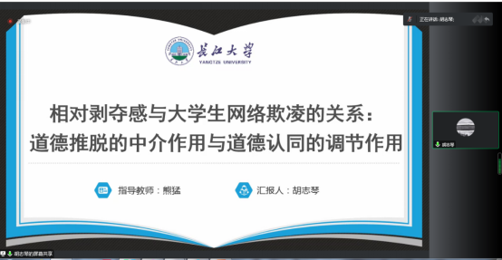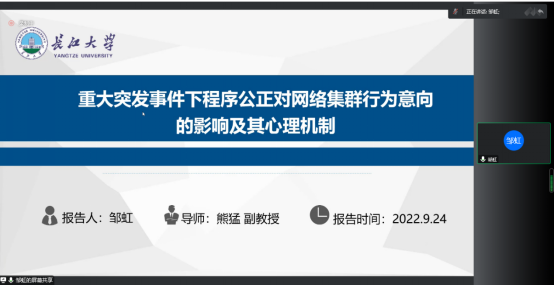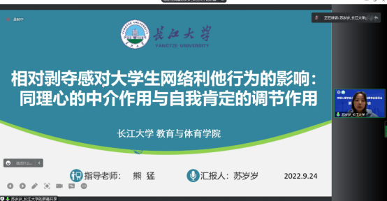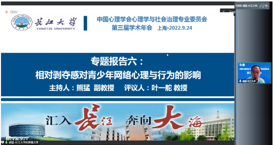 24日下午,熊猛副教授组织并主持了专题论坛“相对剥夺感对青少年网络心理与行为的影响”,通过5篇系列论文,集中展示了其研究团队的最新学术成果。其中,博士生邹虹报告了“重大突发事件下程序公正对网络集群行为意向的影响及其心理机制”,研究生胡志琴、陈姣和苏岁岁分别报告了“相对剥夺感与大学生网络欺凌的关系:道德推脱的中介与道德认同的调节作用”、“How Relative DeprivationAffects Sleep Quality of Chinese College Students: An Integrated Model of Social Anxiety and Mindfulness”和“相对剥夺感对大学生网络利他行为的影响:同理心的中介与自我肯定的调节作用”等三项成果。据了解,该专题论坛中的4项成果是熊猛副教授主持的全国教育科学规划项目、湖北省高等学校哲学社会科学研究重大项目、湖北省社科基金项目和湖北省教育科学规划重点项目的系列成果,受到与会者的广泛关注并在学界引起较好反响。
