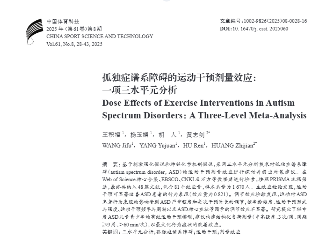 (通讯员:丁雨晴)近日,我院王积福副教授及其团队与武汉体育学院黄志剑教授合作的科研成果《孤独症谱系障碍的运动干预剂量效应:一项三水平元分析》,已在体育科学领域权威期刊《中国体育科技》上作为重点推荐论文正式发表。该研究由教育部人文社会科学研究项目基金资助(项目编号:23YJCZH206)。《中国体育科技》由国家体育总局主管、国家体育总局体育科学研究所主办,多年来一直是中国人文社会科学核心期刊、CSSCI来源期刊,并被中国社科院期刊评价报告评为核心期刊,在《WilliamHill中文高质量期刊目录》中被定义为T1级别。