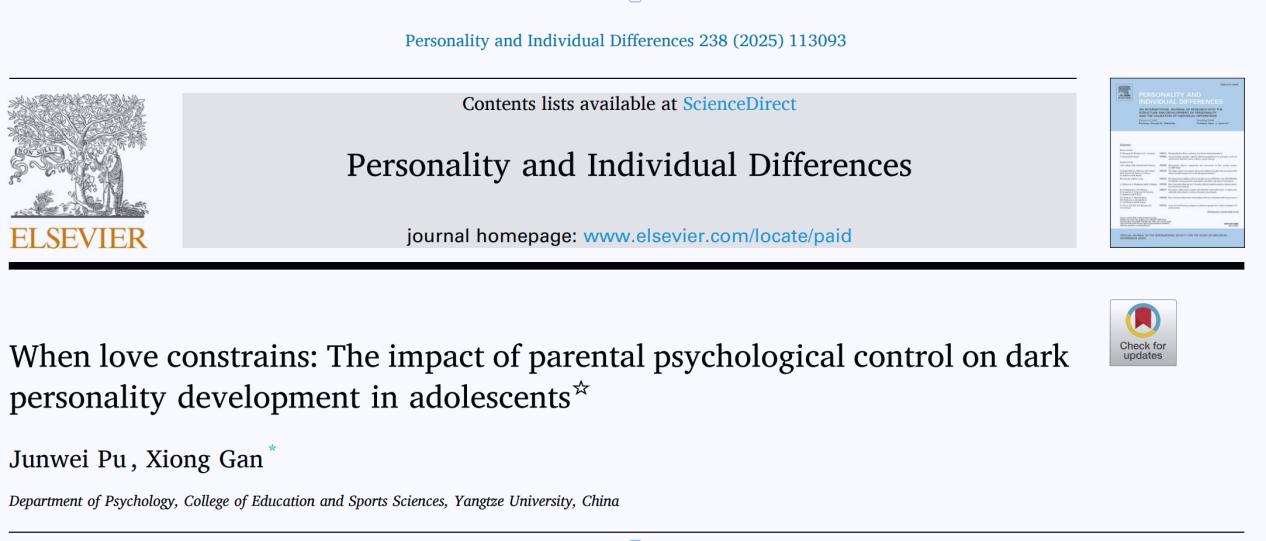 Junwei Pu, XiongGan,Whenlove constrains: The impact of parental psychological control on dark personality development inadolescents,Personalityand IndividualDifferences,Volume238,2025,113093,ISSN0191-8869. https://doi.org/10.1016/j.paid.2025.113093