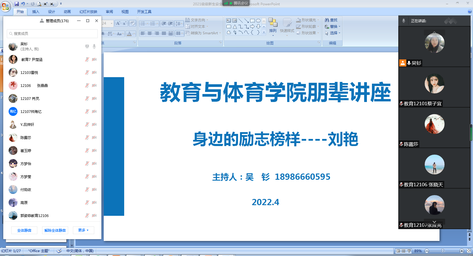 (通讯员 徐坤 李梦瑶)4月21日下午,WilliamHill中文2022年william威廉中文朋辈系列讲座第一讲《身边的励志榜样》顺利开讲。此次讲座由教育学院辅导员吴钐老师主持,体育系学生刘艳同学主讲,william威廉中文全体2021级成员参加,借助腾讯会议线上平台进行。