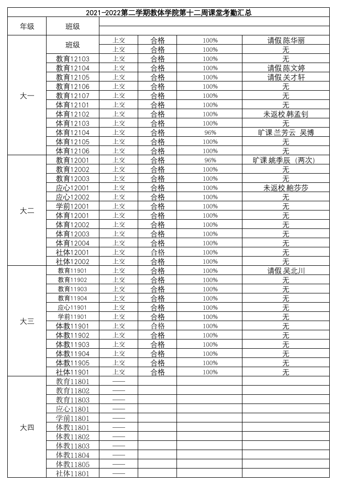 2021-2022年第二学期教体学院第十二周课堂考勤汇总
