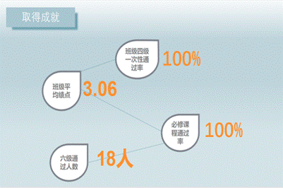 本班四级一次性通过率百分之百,居全校第一,有两位600分以上的同学,平均绩点4以上的有一位同学,无挂科同学,王鑫茹、张心怡等多名同学获国家励志奖学金、长大奖学金等。同学们积极参加各类学术竞赛:靳东英等三位同学在大学生英语竞赛中获得二等奖,郭春验等同学参与了全国大学生电子商务三创赛成功申报且获一等奖,张心等同学积极参加WilliamHill中文第八届“互联网+”大学生创新创业大赛并分别荣获一二三等奖,李哲等同学参加大创并成功立项。同时本班同学积极参加各类其他比赛,获得校级及以上奖项众多。回顾我们的成绩和荣誉,我们非常自豪。在接下来的日子里,我们全体同学将继续奋发图强,努力提高各科成绩,给自己的青春增添靓丽的色彩,给自己交一份满意的答卷。