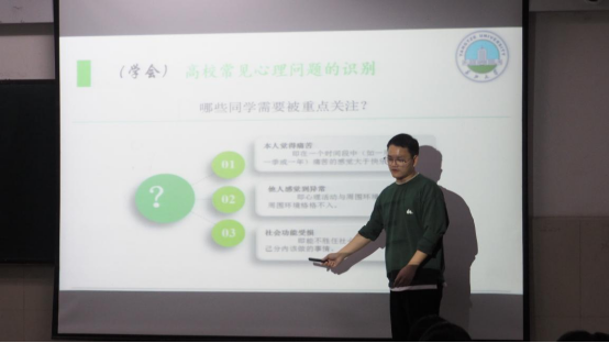 本次心理骨干培训内容共分为四个部分,首先,主讲人借助“艾里克森人格发展八阶段”理论向同学们强调了大学生心理健康的重要性,随后主讲人就“大学生常见心理问题的识别”这一话题进入到第二部分内容,并向心理骨干们阐述了同学们的哪些表现是心理骨干需要去重点关注的,第三部分内容,主讲人帮助心理骨干们从识别、关照、化解三方面来开展各班心育工作,达到自助和助人的目的。第四部分,主讲人向大家介绍了我校的心理健康教育体系和不同校区心理中心的咨询地点及电话,并告诉同学们遇到难以缓解的心理问题,大胆的向心理中心寻求帮助是十分必要的。最后,主讲人利用“双手比人字”的小游戏,告诉同学们在人际交往中要多站在他人的角度思考,学会将心比心。