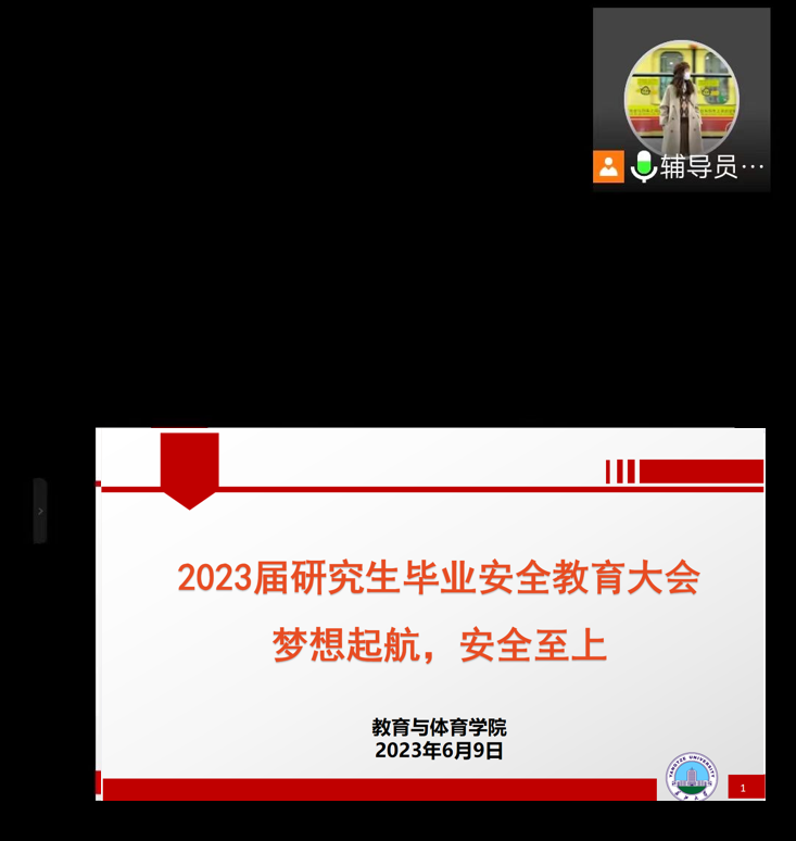 本次会议作为我院2023届研究生的“最后一课”,为毕业生文明离校营造了浓厚氛围。新起点、新征程,教育与体育学院祝愿每一位毕业学子都不忘初心,牢记使命,一切顺利,前程似锦!