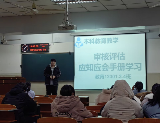 此次活动要求各班以专题班会的形式开展学习教育。活动伊始,班长带领同学们了解审核评估基本常识、热词解读、学校概况和评建工作等基本内容。班内学生正襟危坐,认真学习相关知识。紧接着,班长根据文件内容以及国家教育部的文件要求带领同学们重点学习了文件中第四部分第10、11条的内容。通过本次学习,让同学们明白了在平时学习过程中自己应该从哪些方面着手,也了解了在进行评估工作的时候应该以什么为标准开展工作。本次活动深入开展贯彻相关政策具体内容、全面统筹指导并根据本院特色进行宣传教育,全面提升了我校教育教学的针对性与时效性。