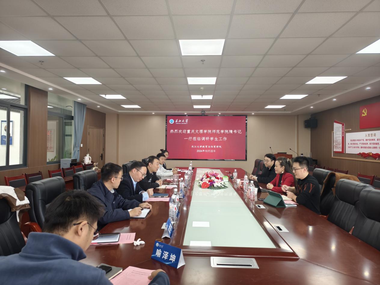 (通讯稿:金楚悦)2024年10月22日上午9:00,重庆文理学院师范学院党委副书记隋剑飞、学工办主任范宣辉、辅导员王凡一行来我院,就学生工作进行深入的调研与交流。本次考察交流会在文科楼905会议室举行,会议由我院党委副书记何可可主持,党委书记于永伟、副院长熊猛、团委书记任雯婷等老师参与交流。