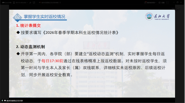 学院第一时间组织召开春季开学班主任和辅导员工作专题会议,会议传达了学校春季学期开学返校时间、宿舍楼栋开放安排等核心要求,明确需按规定填写本科生返校情况统计表,建立开学第一周返校动态监测机制,每日17:30前精准上报返校数据,对未按时返校学生及时与本人及家长双线联系核实情况。会议同时部署了学院新学期开学各项重点工作,压实班主任、辅导员工作责任,确保返校工作闭环管理。