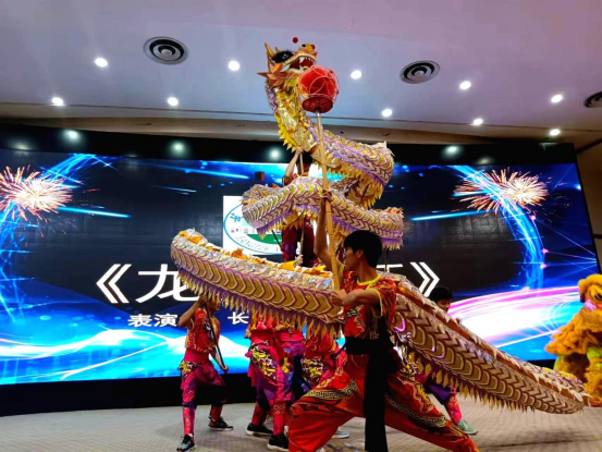 龙腾狮舞送吉祥,成人立志折桂枝。雄狮和巨龙的结合格外引人注目,音声沉沉,狮身大起大落,巨龙盘旋舞动,红黄两种颜色交织在一起,队员们配合默契,龙身灵活晃动,狮首上摇下摆,动作犹如翻江倒海,气氛随着高难度动作达到高潮,引起一片掌声。武术表演一拳一脚刚劲有力,或气势如虹,或行云流水,将中国传统武术文化演绎得淋漓尽致,精彩的表演赢得了台下观众的阵阵喝彩。